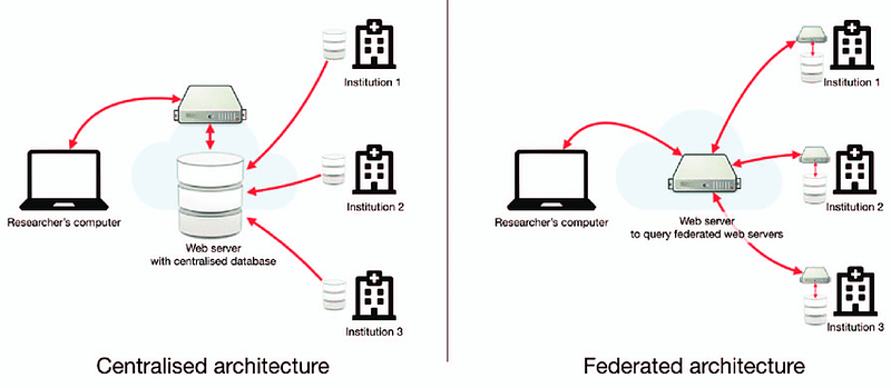 The above image gives examples of two common data architectures that can be adopted to enable researchers to access and analyse data gathered from different institutions.